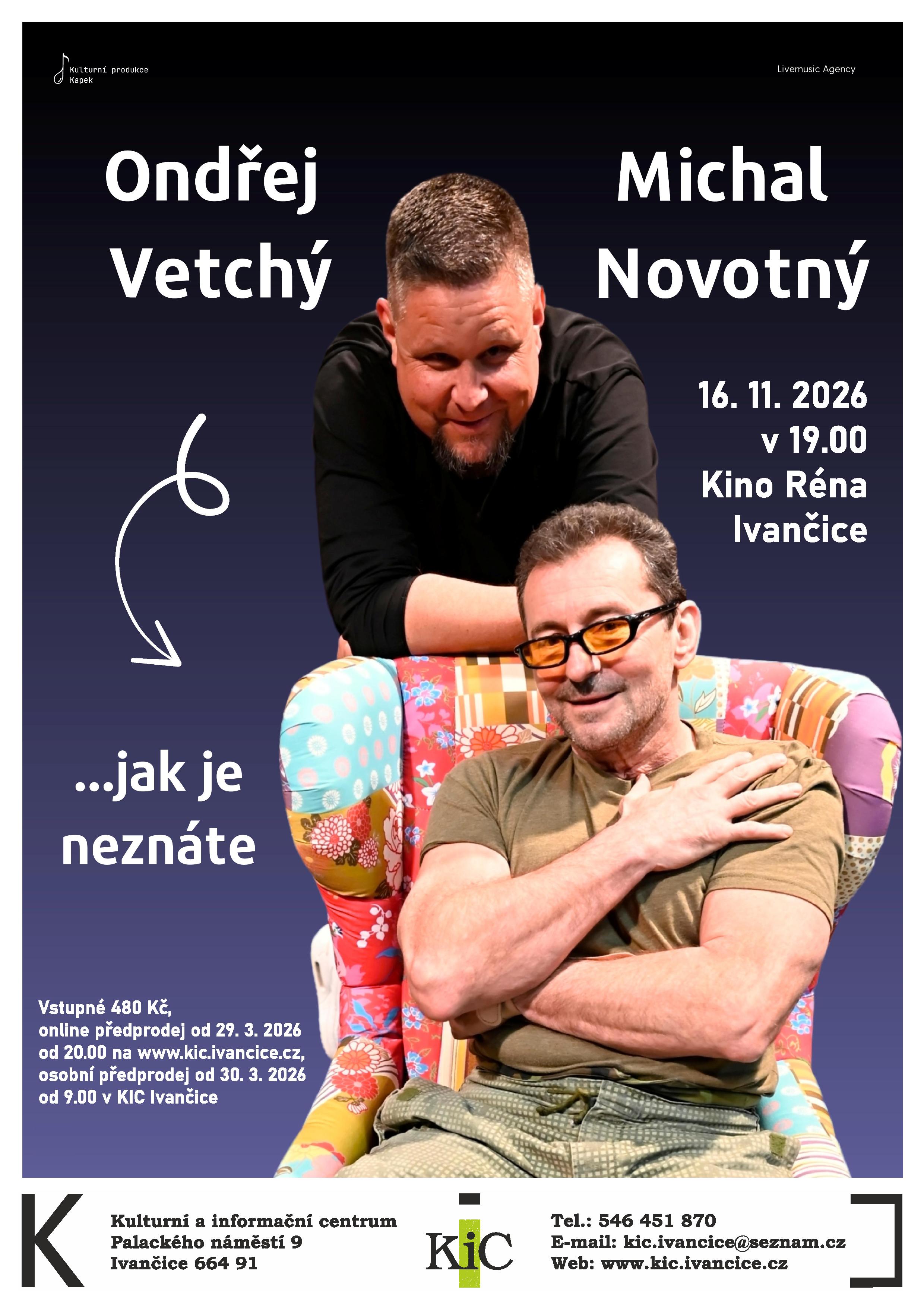 Vstupné 480 Kč. Online předprodej od 29. 3. 2026 od 20.00 na www.kic.ivancice.cz. Osobní předprodej od 30. 3. 2026 od 9.00 v KIC Ivančice.
