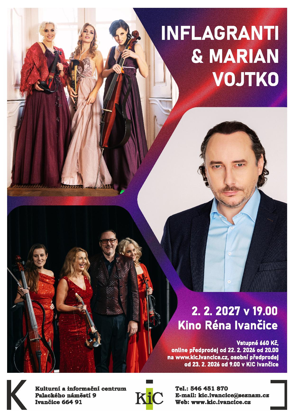 Přijměte pozvání na unikátní hudební večer, kde se spojuje dravost elektrických smyčců a noblesa muzikálového hlasu. Trio INFLAGRANTI v doprovodu charismatického tenoristy Mariana Vojtka vám naservíruje slavné světové hity, rockové pecky i filmové melodie v originálních aranžích, které vás nenechají v klidu. Virtuózní souhra tří půvabných dam a energie jednoho z našich nejlepších muzikálových zpěváků.
